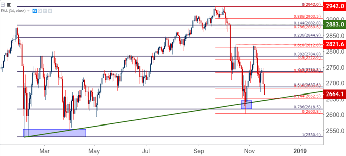 It’s been another brisk start to the week as stock bears continue to push in equities. Yesterday’s tech sell-off continued the seven week pattern of pain, as the Q4 open in October marked a clear change-of-pace in the equity trade. The Dow Jones Industrial Average is now trading below the psychological 25k marker, and the S&P 500 sits atop the November swing-low. A temporary respite was seen in this theme last week on the heels of some less-hawkish comments from FOMC Chair, Jerome Powell. That recovery held into the weekend, but it appears that this was long forgotten by the time we got to the Monday open, and prices have now peeled away all of those gains and then some in the S&P 500.