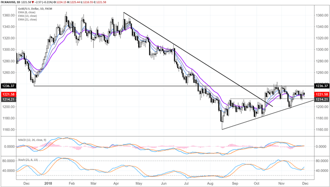 For traders, there’s not much to like about the current technical structure of Gold prices, no matter what strategy perspective you take. With neither bulls nor bears able to take control over the past two months, Gold has found itself unable to retake the December 2017 swing low of 1236.37, which price has not closed above since its failure on July 17. Multiple tests in late-October and early-November proved fruitless as well. In terms of support, the October 11 bullish outside engulfing bar low has not been test since it was established; the November 13 swing low came in just above at 1196.17.